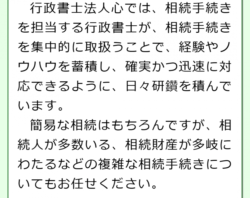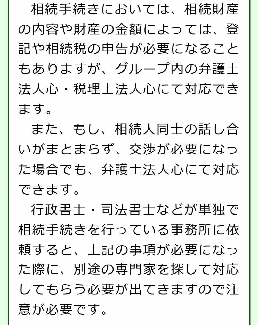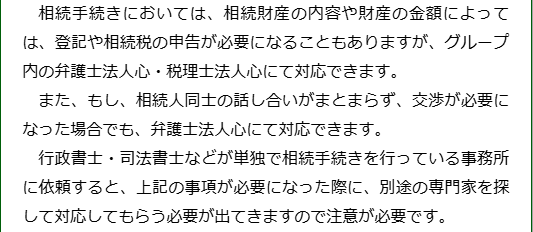 相続手続きに慣れている者にお任せいただくことで、相続手続きを効率よくスムーズに進めることができるという点も、メリットかと思います。